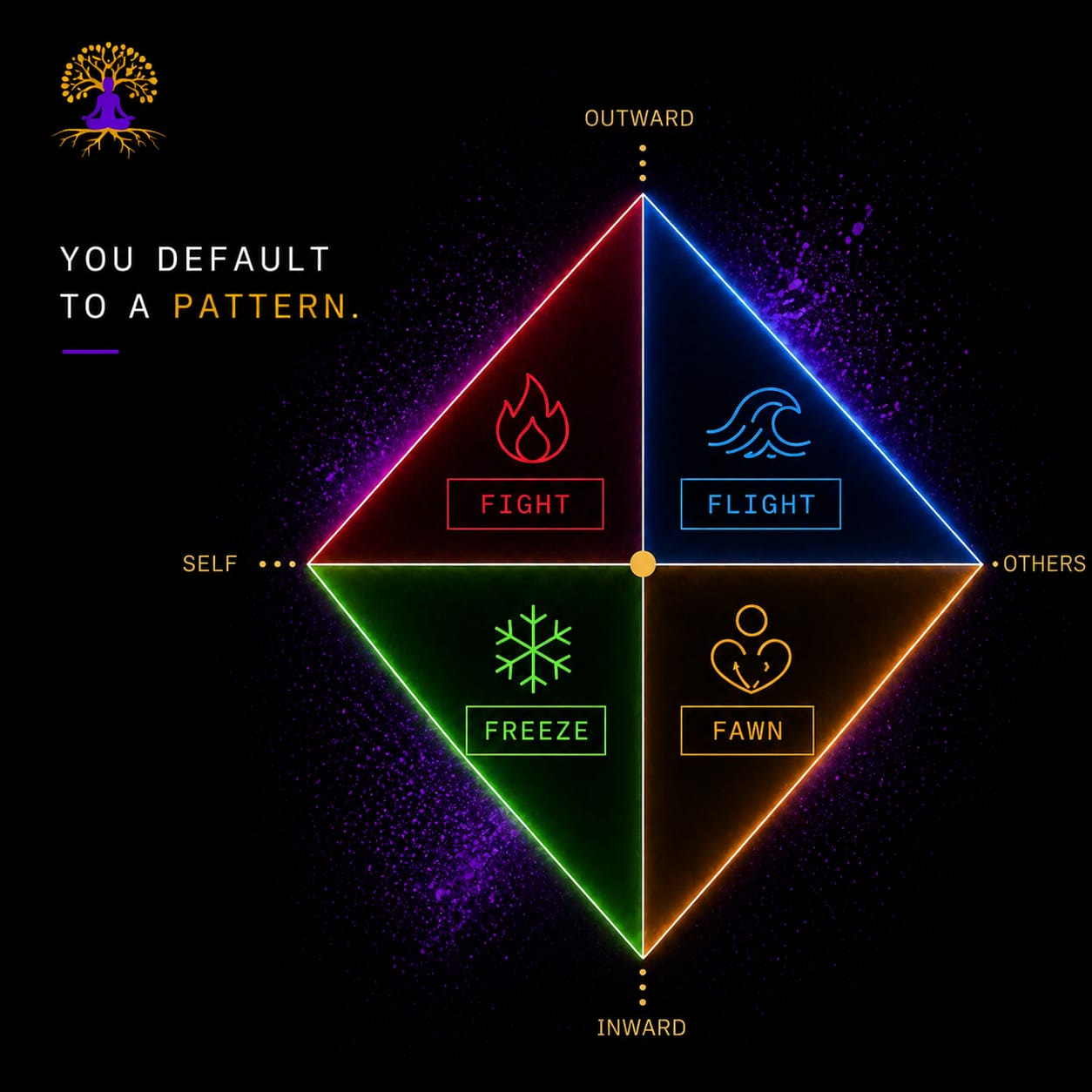 There are four of them. Fight, the pattern that controls, pushes, defends, turns pressure into aggression or dominance. Flight, the pattern that avoids, hustles, distracts, escapes into busyness or the next horizon. Freeze, the pattern that shuts down, goes numb, stalls when it matters most. Fawn, the pattern that pleases, accommodates, loses itself in the needs of others.